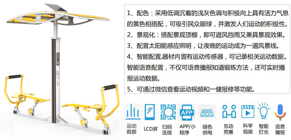 开元全民健身产品涵盖健身路径、运动场馆、篮乒气羽排等产品,分为多个系列,先进的制造工艺、严苛的质量检测,确保产品性能优良、品质安全可靠,让运动简单科学。并将全民健身器材(户外路径器材、体育场馆等产品)进行智能化升级和互联,实现全人群覆盖、全场景智能,让运动赞美生活。