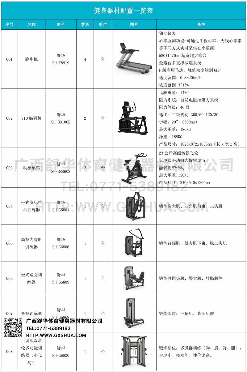 1.开元V9跑步机SH-T8919*4台-580*1570mm超宽超大跑台-跑感舒适,跑台整体安全稳定;全跑台多支撑减震平台,保证跑台超强支撑力,达到180kg支撑,满足专业健身房需求。F级商用马达-超强马达,AC 3.0HP 交流,峰值功率达到6HP,F级商用品质。速度范围达到0.8-20km/h;V9跑步机可实现跑台扬升功能,坡度范围-3~15%,满足客户不同的锻炼需求。