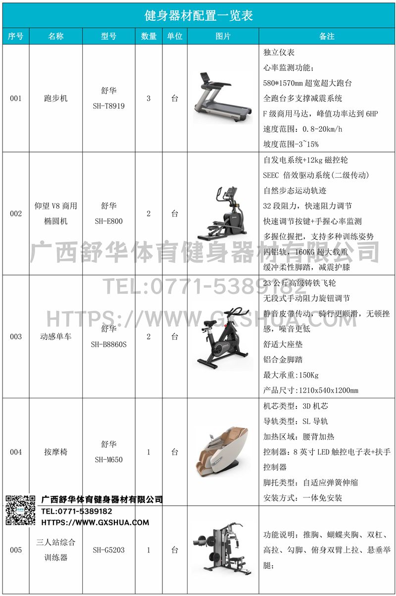 1.开元V9跑步机SH-T8919*3台-F级商用马达-超强马达,AC 3.0HP 交流,峰值功率达到6HP,F级商用品质。速度范围达到0.8-20km/h;V9跑步机可实现跑台扬升功能,坡度范围-3~15%,满足客户不同的锻炼需求。