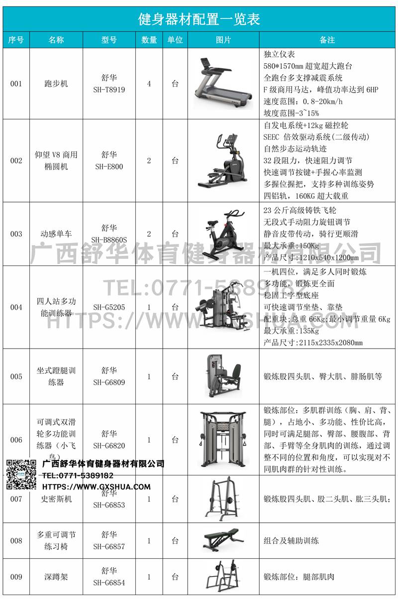 蹬腿训练器(1台)、小飞鸟(1台)、史密斯机(1台)、深蹲训练器(1台)、多重可调节练习椅(1台)、腹肌板(2台)、10付哑铃套组(1套)、哑铃凳(1台)、杠铃片架(1台)、可以实现对不同肌肉群的针对性训练,满足肌肉训练需求,全方位激活身体机能。